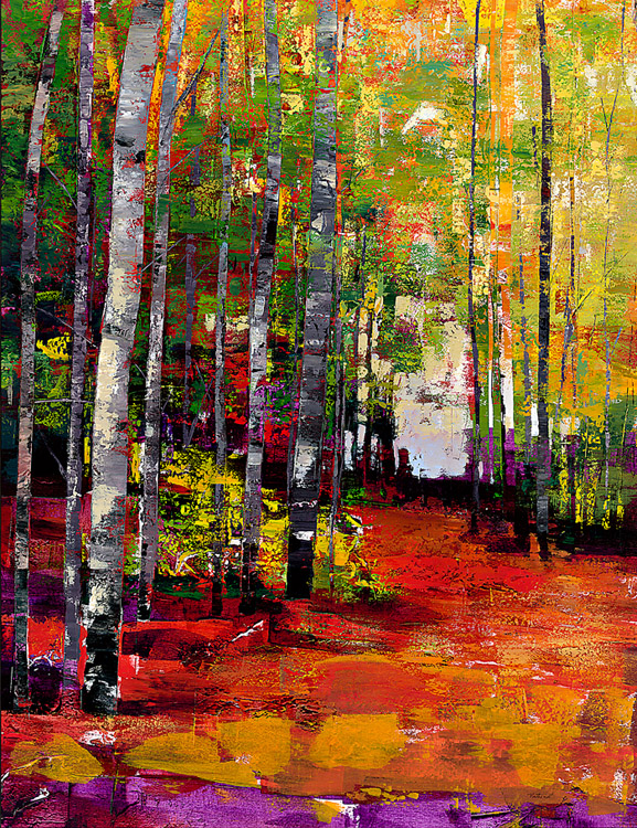 Enhanced embellishment - all over texture, hand painted details, with double the embellishment (with glitter, leaf, or texture, *depending on the nature of the art). Option of satin, gloss finish or high gloss finish, determined by what original work of art had--please let your Viapagi Consultant know if you want a specific finish.